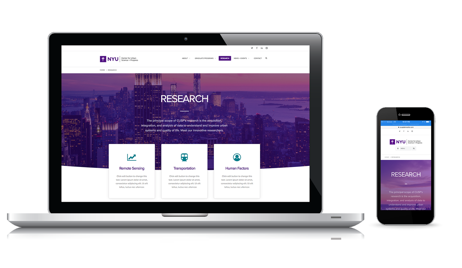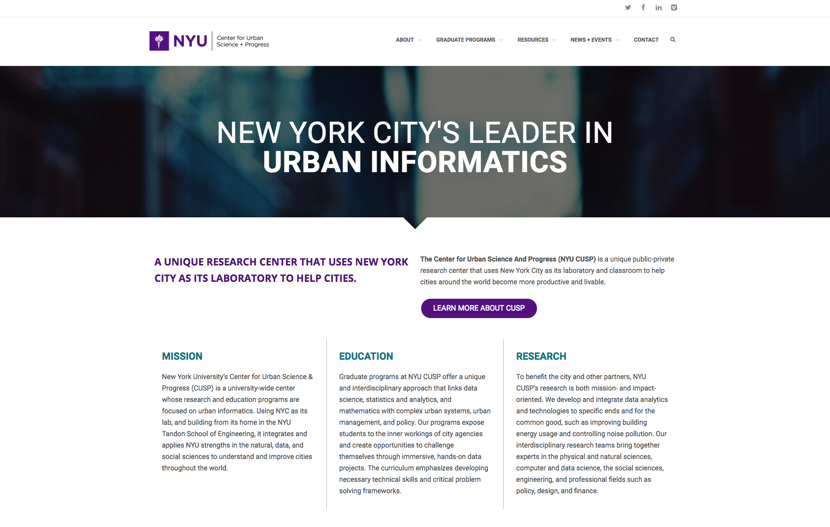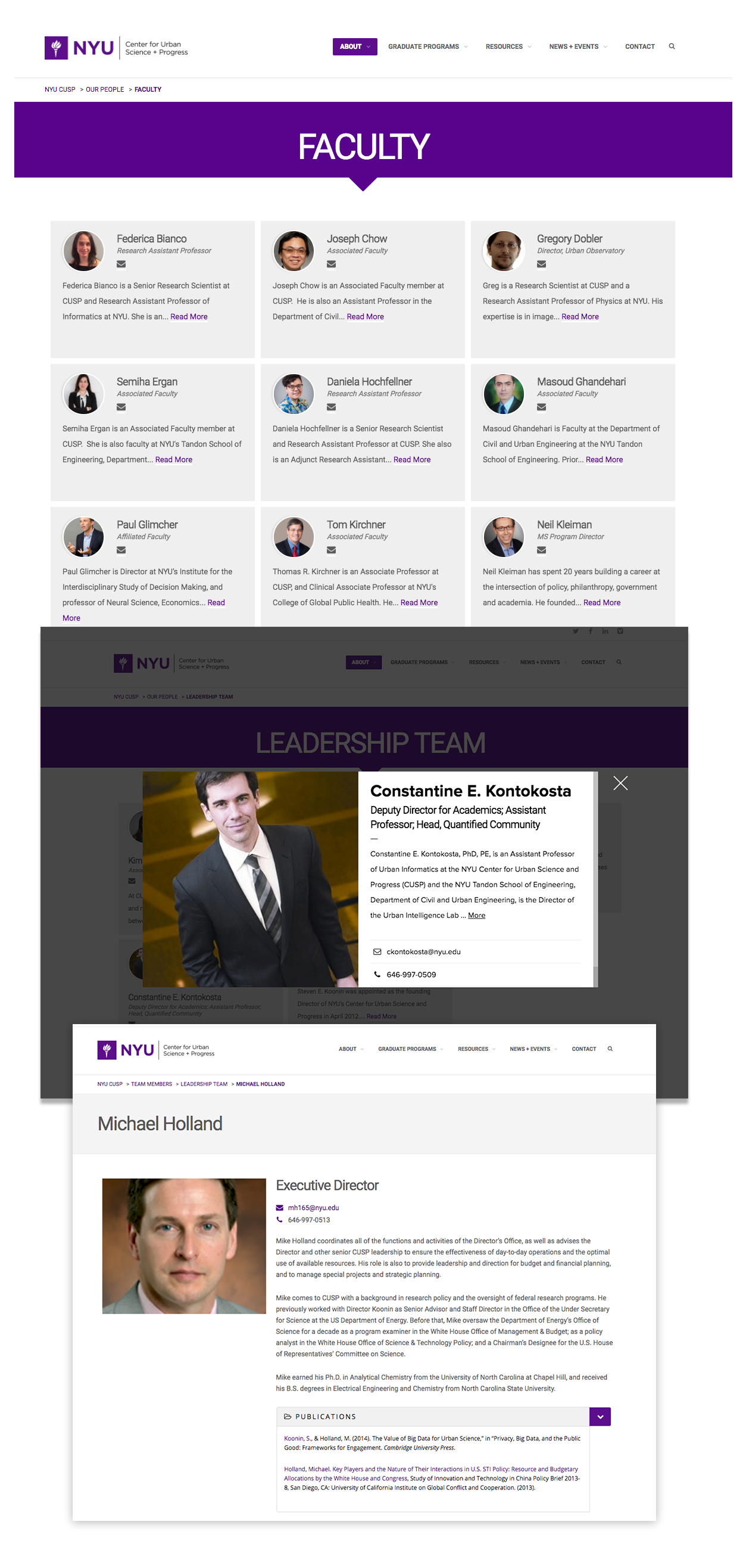 The situation: The NYU's Center for Urban Science and Progress needed a new website, it is a prestigious educational institution with renowned faculty and students from across the world. With their work with the Hudson Yards development and numerous initiatives, they needed a fresh look. With their prior site, they didn't have admin access to be able to make much needed changes to their site (there was old dated information on the homepage that couldn't be removed), the site needed a more contemporary appearance and it needed to be rebuilt from the ground up. They needed the user experience to be seamless across desktop, mobile and larger screens. Based on past user research and experiences, as well as analytics, team feedback and guidance, there was a series of new technology I provided to the school to address solutions to various specific needs of the school.